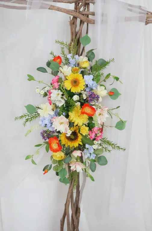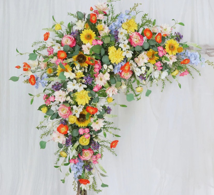 Celebrate your love with a breathtaking wildflower-inspired floral Tie-Back, designed to bring the magic of nature to your wedding day. This boho-style arbour features a stunning mix of sunflowers, daisies, dahlias, and ranunculus, creating a warm and romantic atmosphere that’s perfect for a gazebo, ceremony backdrop, or outdoor wedding setting.